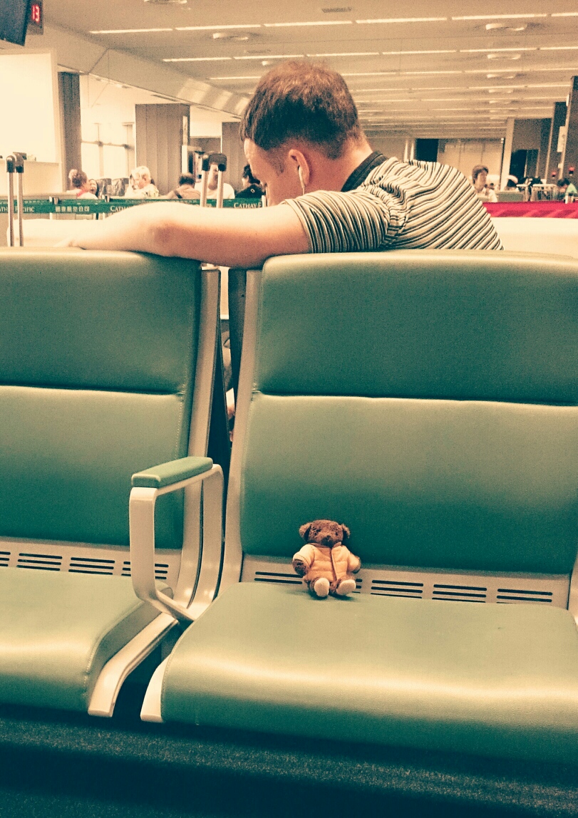 9. 出張に連れていくくま空港の緑のベンチに置いていくくま